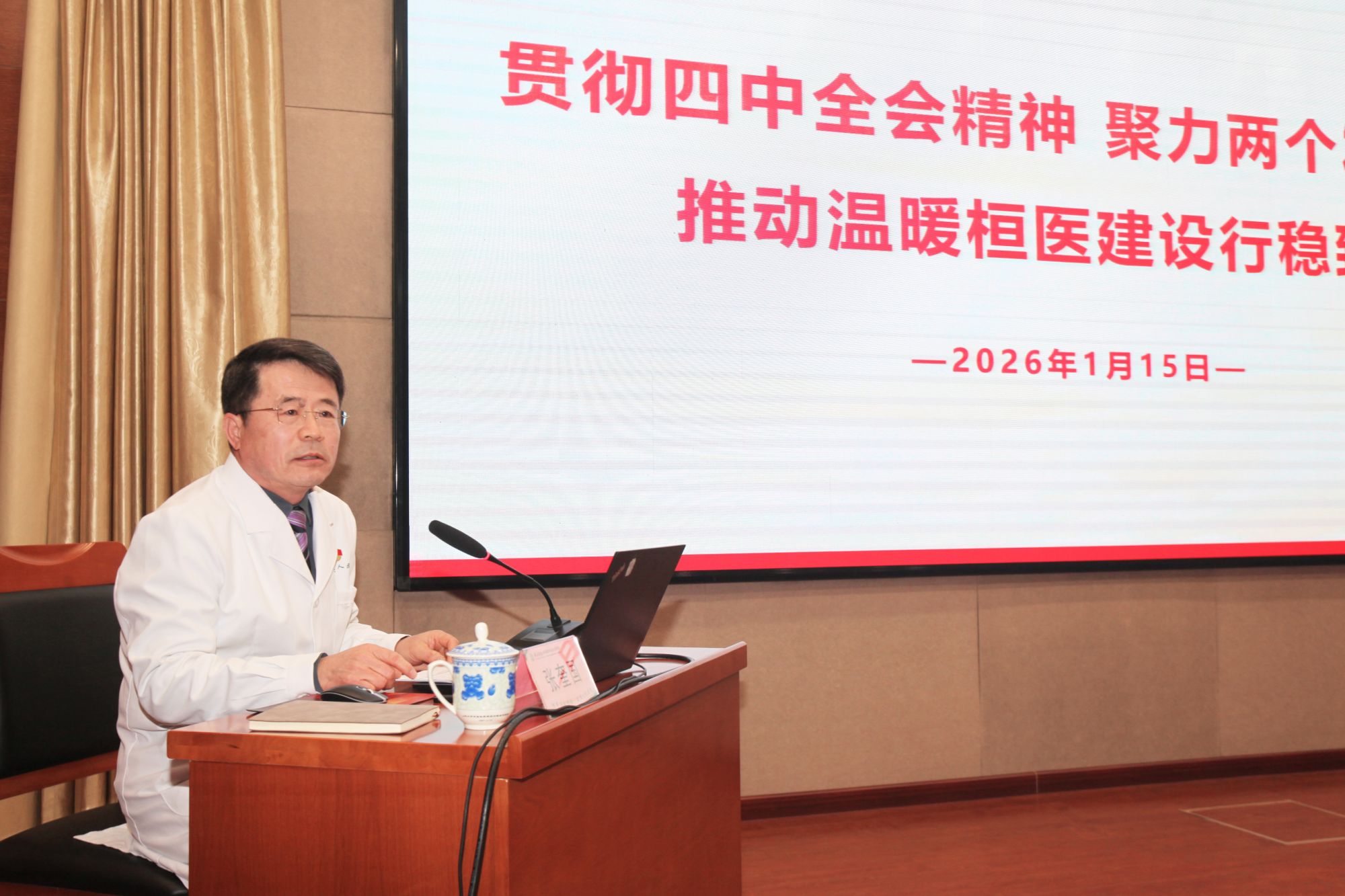 1月15日,我院举办2026年第一期桓医学习论坛——《学习贯彻四中全会精神专题党课》。院党委书记张奎国以“贯彻四中全会精神,聚力两个发展目标,推动温暖桓医建设行稳致远”为题,为全院党员干部讲授了一堂内容丰富、思想深刻的专题党课。院党委领导班子、各支部书记、科室负责人、部分党员代表、民主党派及无党派人士代表近200人参会。