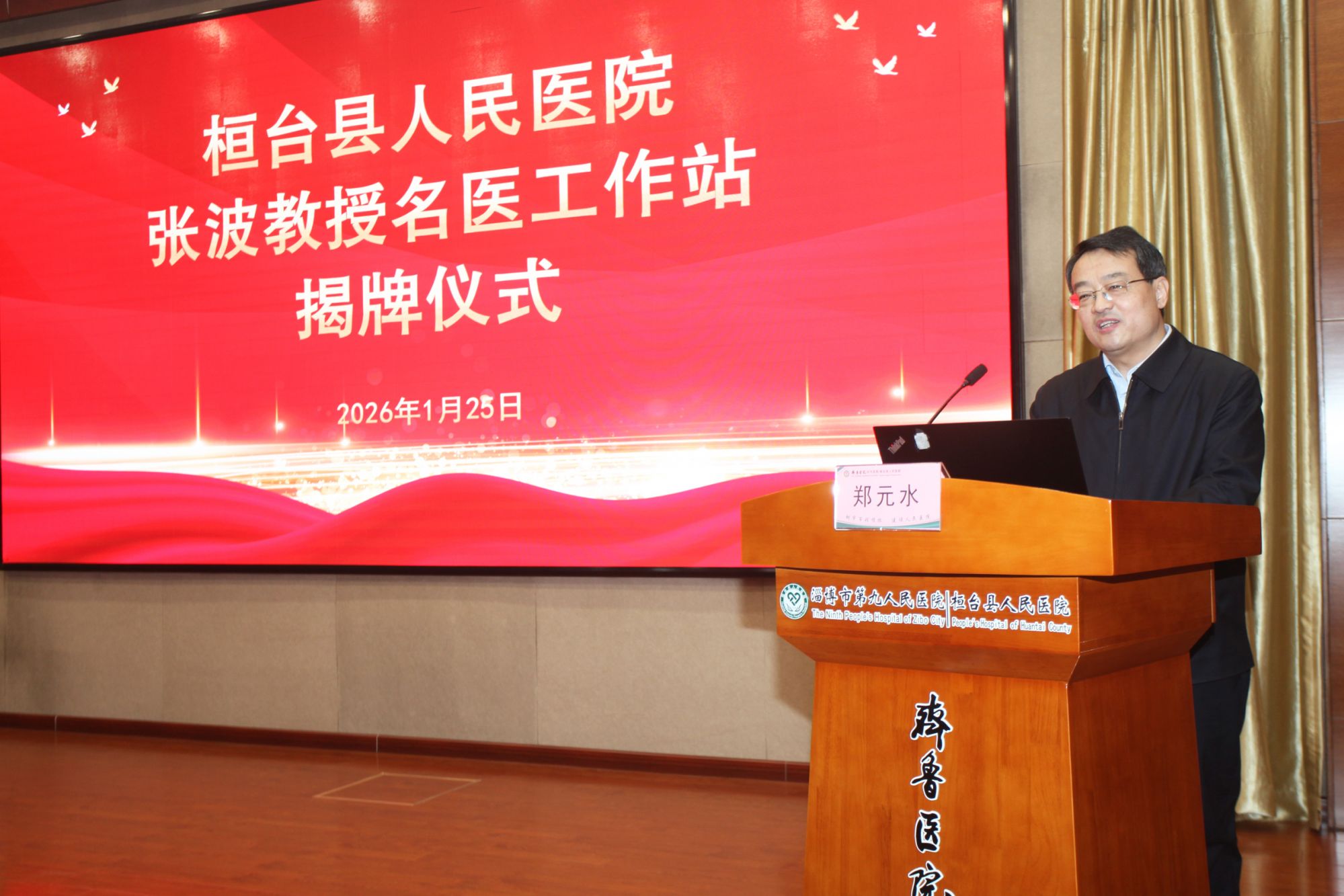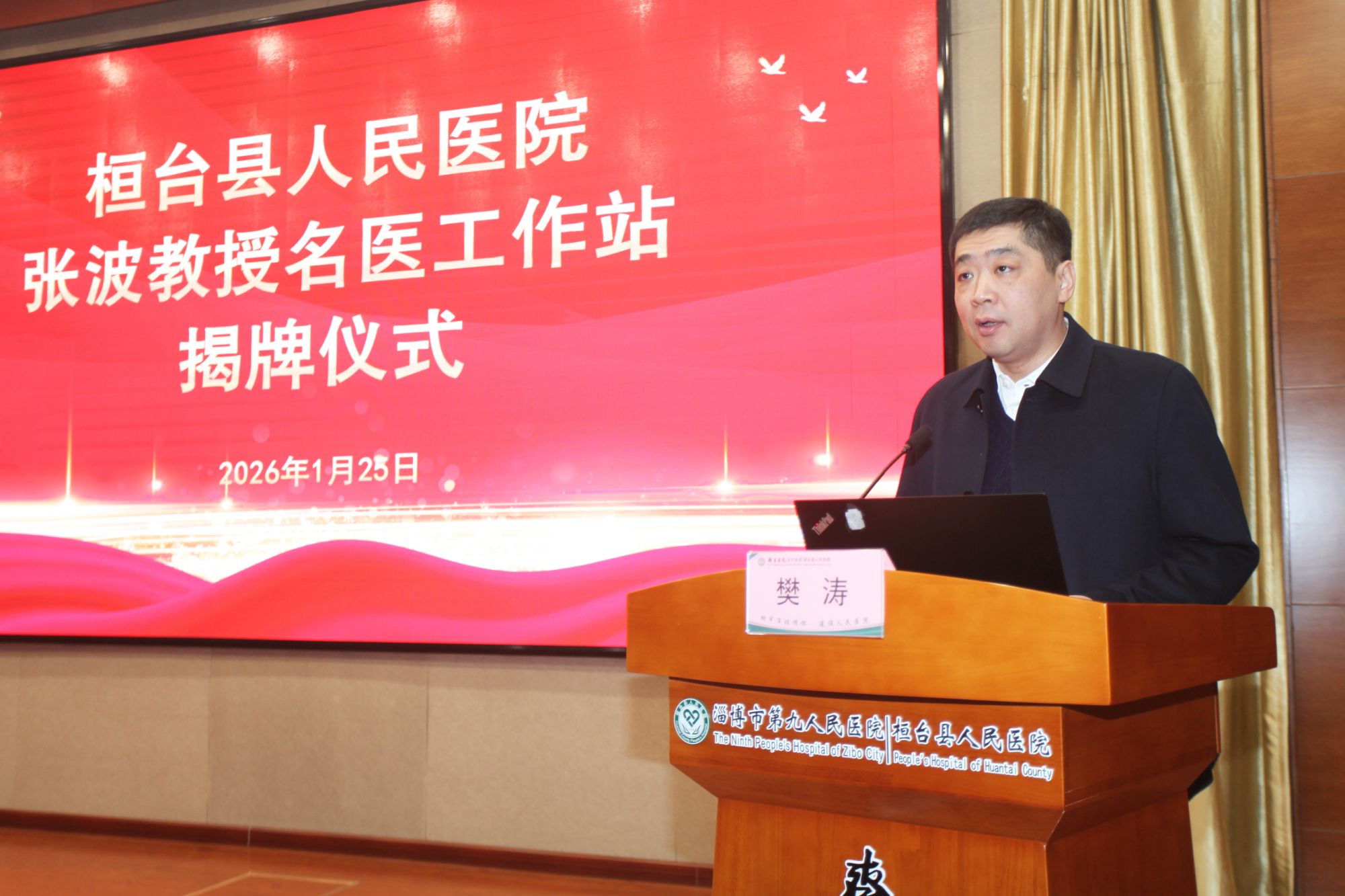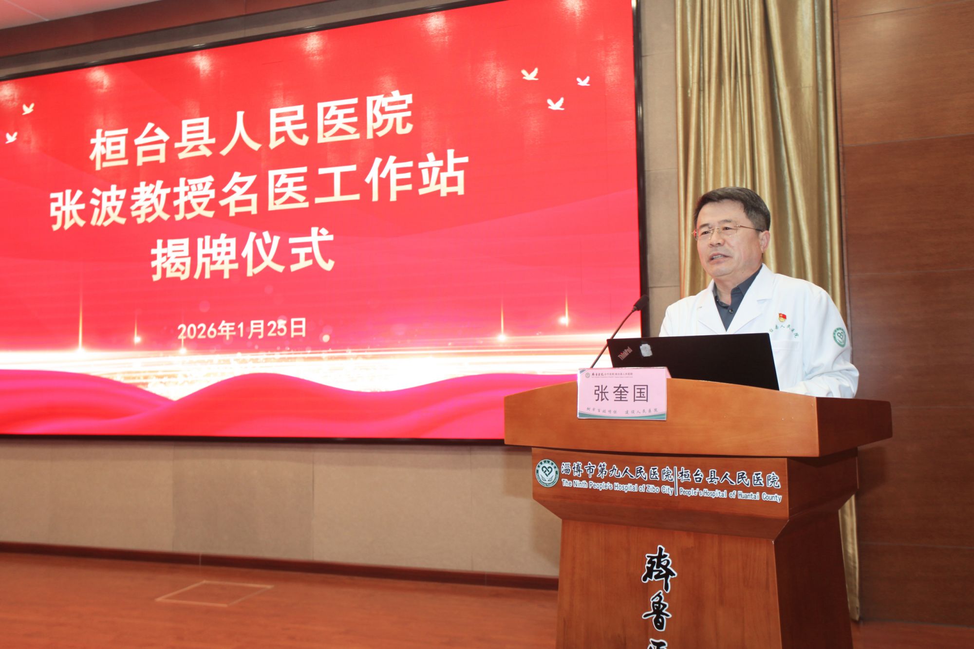 副县长樊涛主持揭牌仪式。 张奎国在致辞中表示,张波教授是从桓台走出去的学者和医者,凭借深厚的学术造诣、精湛的医疗水平和高尚的医者风范,在国内医学界树立了崇高的地位,是全县人民的骄傲。他说,张波教授不仅是个医学大家,更是一个富有浓厚人文情怀和鲜明学术特色的思想者,其所秉持的“临床思维、无创诊疗、逻辑分析”理念体系,正是现代价值医疗思想理念的精髓体现,这一体系的引入必将给医院学科建设、人才培养和医疗服务模式革新,注入最先进、最强大的思想动能和实践指南。医院将全力做好服务保障,虚心学习,着力在复杂疾病诊疗、学科内涵深化、科研项目攻关以及临床思维训练等方面取得实质性突破,真正让工作站的落地转化为提升医院核心竞争力的发展实效,转化为惠及全家万户的健康福祉。 张波教授对医院呼吸与危重症医学科近年来取得的成果给予高度肯定,并对能够回到家乡开展工作表达了深厚的情感。他强调,工作站成立后,将以呼吸系统感染与疑难重症临床诊疗为核心,持续强化学科能力、推动技术创新,全力提升桓台地区呼吸系统疾病的综合诊治水平,切实为家乡群众的呼吸健康贡献力量。 郑元水对我院在学科建设、运营管理及医疗服务等方面取得的成效给予了充分肯定。他表示,呼吸系统健康是全民健康的基石,也是推进“健康淄博”建设的关键环节。张波教授作为我国呼吸与危重症领域的权威专家,此次工作站落户桓台县人民医院,是推动全市优质医疗资源扩容下沉、促进医疗均衡发展的重要举措,将为我市呼吸学科建设、人才培养和科研创新注入新的动力。他期望桓台县人民医院紧抓此次机遇,在张波教授的引领下,持续提升诊疗水平与学科影响力,着力建设区域呼吸疾病诊疗高地,让优质医疗服务更好地惠及人民群众。 张波教授、郑元水主任为“张波教授名医工作站”揭牌。 揭牌仪式后,举办第二期“桓医学习论坛”,张波教授以“学科建设与运营管理”为主题作专题授课。他结合个人成长历程与丰富管理经验,围绕学科发展方向定位、临床基本技能强化、疑难危重病例救治能力提升以及科研意识与思维培养等方面,进行了系统而深入的阐释,为医院优化学科发展路径、提升综合运营管理水平提供了宝贵借鉴与指导。 张波 中国人民解放军空军总医院原副院长 中央军委保健会诊专家 医学博士、主任医师、教授、博士研究生导师 呼吸与危重症知名专家,长期从事呼吸危重病专业和高干医学保健工作,擅长呼吸危重病的救治、呼吸疑难/少见病的诊断和治疗、重症肺部感染的诊断与治疗、各种类型急、慢性呼吸衰竭的诊断与治疗、骨髓移植及肾移植后肺部并发症的处理、肺部疑难病的影像学诊断等,尤其精通呼吸机应用技术,成功救治了多例疑难、危重的急性呼吸衰竭患者。任中华医学会呼吸病分会ICU与呼吸生理学组委员,中国呼吸医师分会委员,北京医师分会呼吸医师专家委员会副主任委员,解放军呼吸专业委员会委员。兼任《中国实用内科杂志》、《中国呼吸与危重监护杂志》、《世界急危重病杂志》、《内科理论与实践杂志》、《临床肺科杂志》编委;《国际呼吸杂志》、《中国医疗杂志》常务编委。发表各类学术论文60余篇,获国家科技进步二等奖1项,军队科技进步二等奖一项,军队医疗成果二等奖两项,主编专著2部,参与编写大型呼吸系统疾病专著5部。