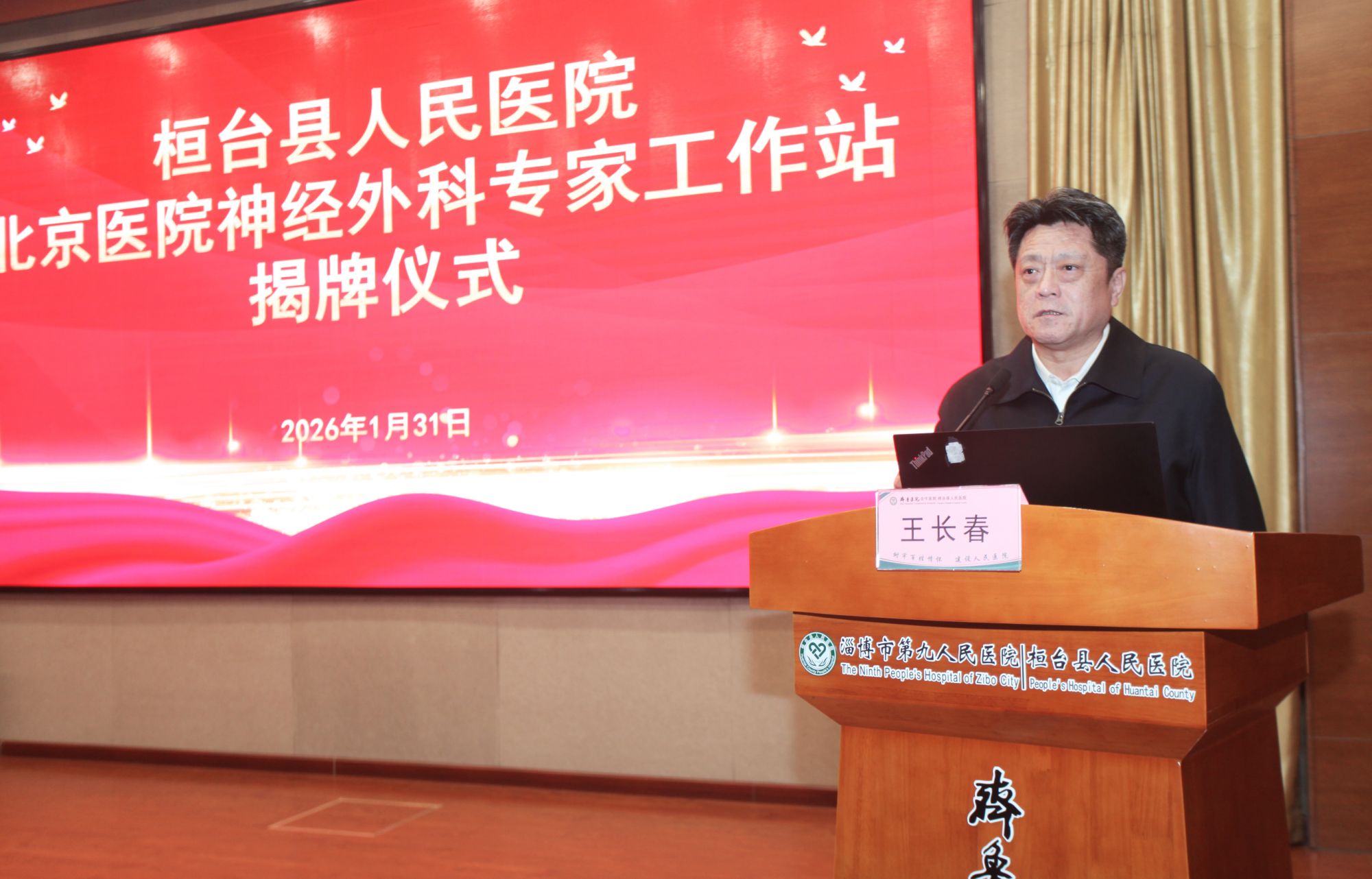 王涛局长主持揭牌仪式 张奎国在致辞中表示,北京医院是一所承载着光荣历史与卓越声誉的医学殿堂,特别是北京医院神经外科作为国家级临床重点专科,以其在神经外科疾病及脑血管病诊治领域的顶尖实力,成为全国同行景仰的研修中心。工作站的成立,必将为医院在临床技术革新、复杂疾病诊疗、科研思维训练乃至管理理念升级上注入为最强劲的、可持续发展的核心动力。医院将以最虚心的态度学习,以最周到服务保障,以最扎实行动对接,确保专家的每一份智慧都能在桓台落地生根,开花结果。相信在专家们悉心帮助指导下,医院神经外科各关键领域必将实现突破性提升,迎来跨越式发展,进一步织密县域人民群众神经系统健康防护网,让桓台及周边地区群众能够享受到国内顶级的神经外科精准诊疗服务。 王长春教授表示,此次在桓台县人民医院设立专家工作站,是推动国家优质医疗资源下沉基层的重要举措。团队将通过技术帮扶、人才培养、远程协作等形式,切实将北京的优质医疗资源带到桓台,提升区域神经疾病诊疗能力,惠及更多群众。同时,依托工作站平台,积极探索跨区域医疗协作创新模式,共同构建高效便民、覆盖基层的医疗服务体系。 樊涛表示,北京医院神经外科专家工作站的成立是桓台县积极对接高端医疗资源、加强名医专家引进工作取得的又一重大突破。他强调,医院要在专家团队的精心指导下,强化专科建设,优化服务流程,培养本土骨干,力争在医疗技术、科研创新、人才培养等方面实现全面跃升,真正把工作站建设成为技术高超、服务优质、群众信赖的品牌专科,大幅提升我县在神经外科等复杂疑难疾病领域的救治水平,切实减轻群众外出求医的负担,让桓台及周边百姓在家门口就能享受到国家级专家的优质医疗服务。 王长春教授、樊涛副县长为“北京医院神经外科专家工作站”揭牌。 王长春教授向医院赠送医疗物品和书籍。 会上,裴傲教授、刘加春教授先后进行学术分享。