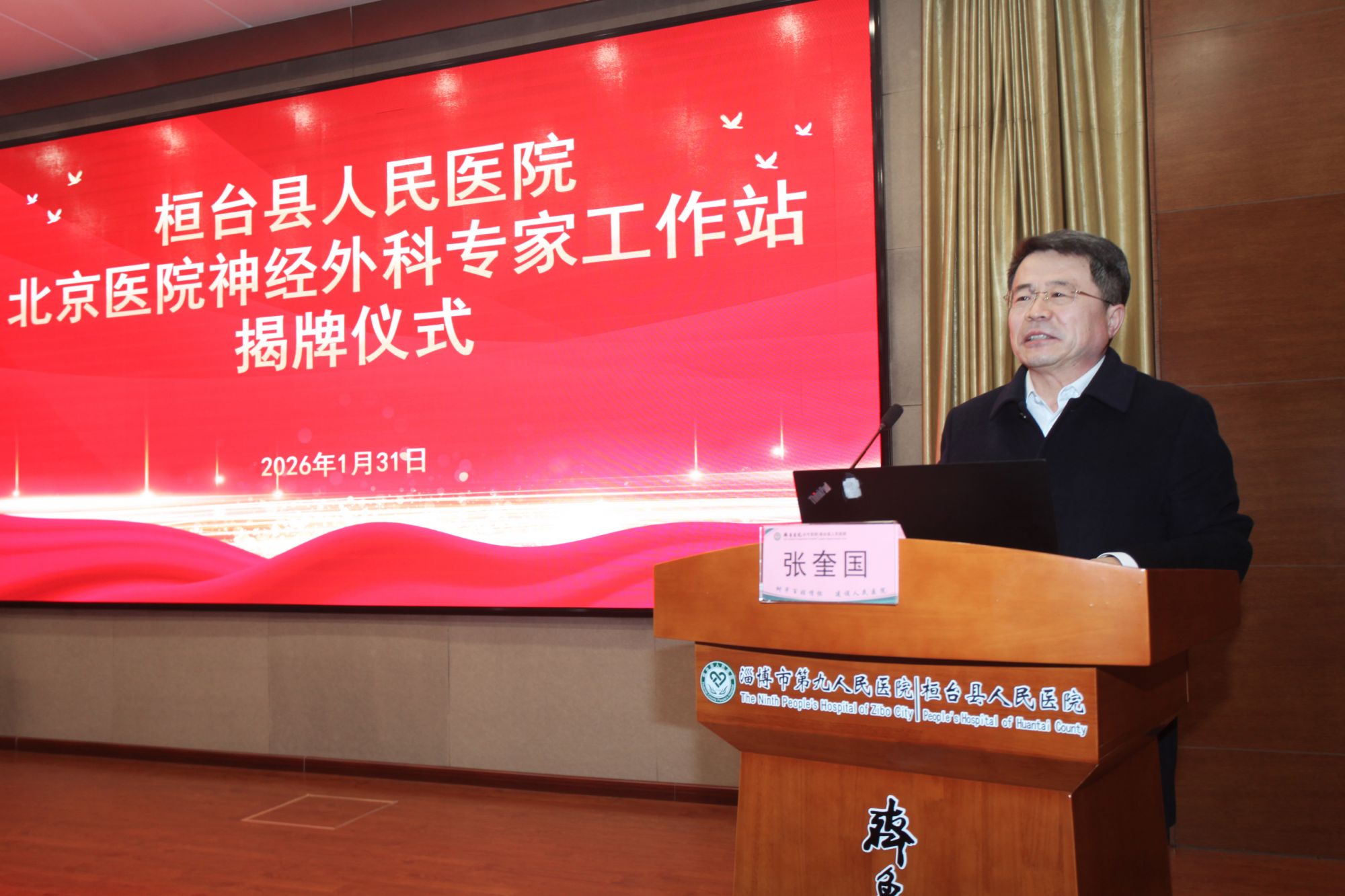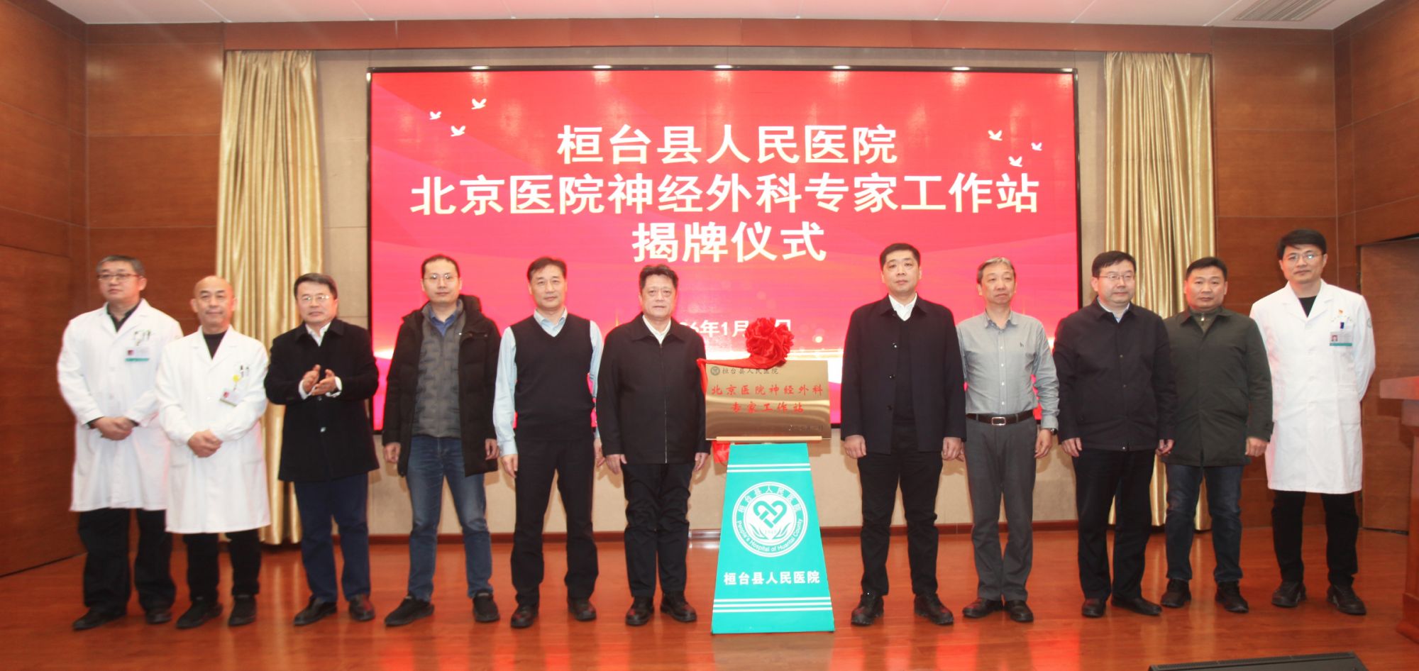 1月31日,北京医院神经外科专家工作站揭牌仪式在我院举办。北京医院神经外科王长春教授、裴傲教授、刘加春教授、王海峰教授,副县长樊涛,县卫健局局长王涛、副局长成钢,院党委书记张奎国出席仪式。院党委成员,院长助理,各科室负责人,各镇卫生院及社区卫生服务中心主要负责人200余人参加活动。