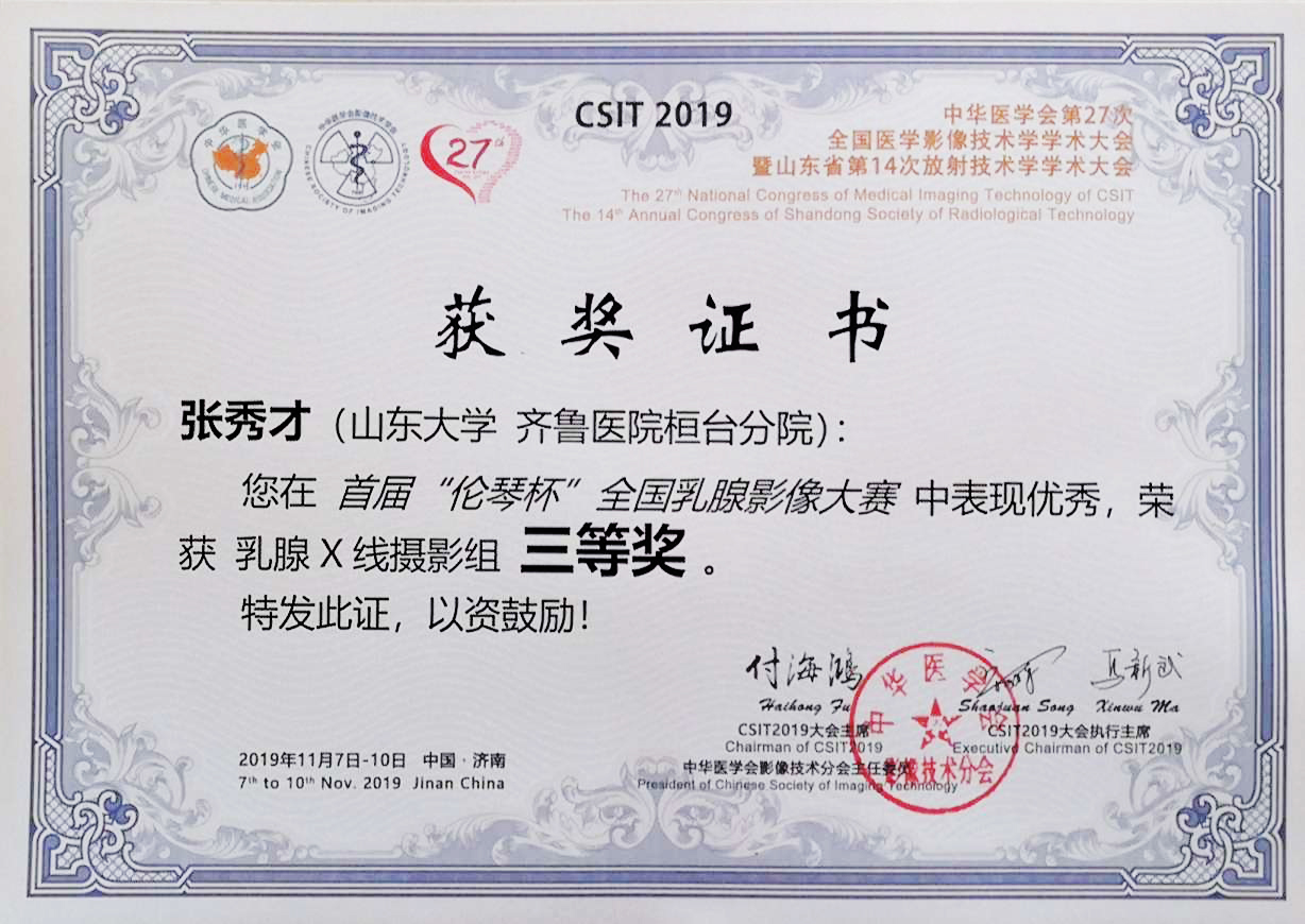 参赛选手中评选出一等奖1名,二等奖2名,三等奖3名。我院放射科张秀才主任是唯一一个县级医院获奖者,并受邀在中华医学会第27次全国医学影像技术学学术大会上作交流发言,分享了乳腺X线摄影的规范化操作以及实际工作中的心得体会。