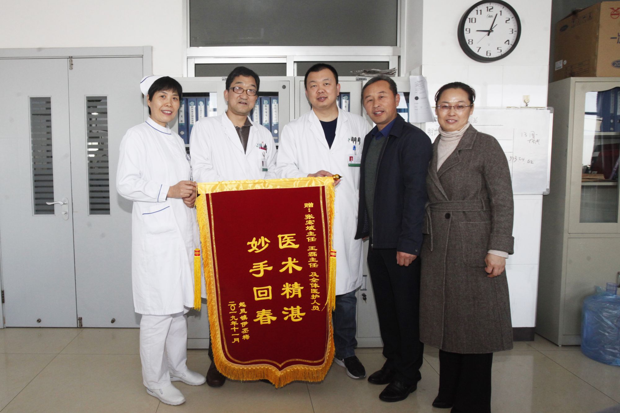 患者家属为心内科一病区送锦旗表示感谢 2019年10月29日上午10点21分,桓台县人民医院介入导管室里,在外焦急等候的患者家属得知母亲抢救成功时,激动地跪倒在地,喜极而泣。 患者是一名78岁老年女性,因急性胸痛加重2小时被送至我院急诊科,心电图提示大面积心肌梗死!急诊科立即启动胸痛绿色通道,心内科一病区及介入导管室工作人员迅速到位,紧急为患者进行造影和介入支架置入手术。 造影发现老人前降支和右冠脉两大心脏供血动脉完全闭塞!就在医生准备放入支架,打通闭塞血管时,老人突然出现意识丧失,心跳骤停。在场医护人员在张宏斌主任的指挥下,立即投入到抢救中,护士注射抢救药物,医生一边进行心脏按压、一边进行支架置入手术。2分钟后,老人恢复了自主心律。 但由于老人血管条件太差,根本无法维持有效的呼吸和心跳,再次出现了心跳骤停。急诊PCI团队不抛弃,不放弃,大家齐心协力与死神作斗争。在一次次的电除颤和不间断的心肺复苏下,奇迹出现了,老人恢复了自主呼吸和心跳。 经过60分钟的奋力抢救,急诊PCI团队成功为患者开通闭塞血管,置入3枚支架,老人转危为安。 目前,老人已康复出院,老人家属特意送来一面锦旗表达感激之情,老人家属握着张宏斌主任和王磊主任的手激动地说:“感谢桓台县人民医院心内科给了我母亲第二次生命!”