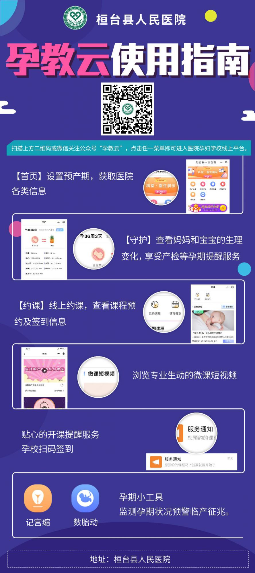 为保障母婴安全,避免交叉感染,疫情期间,桓台县人民医院特别推出线上孕妇课堂,让广大孕妈在家就能学习科学的孕期保健知识,欢迎广大孕妈扫码报名参加! 预约流程 一、扫描下方二维码或微信关注公众号“孕教云” 二、点击右下方“我的医院” 三、填写您的出生日期和预产期后,点击“开始使用” 四、在约课界面,点击“我要预约” 五、查看课程详情,点击“我要预约” 六、确认您预约的课程正确,点击“确认” 温馨提示:孕妇课堂授课时间为每周一、周五上午10:00-10:30,每期课程可进行视频回放。特殊时期,各位准妈妈们一定要坚持网上学习孕期知识。 咨询电话:杨老师18505338683