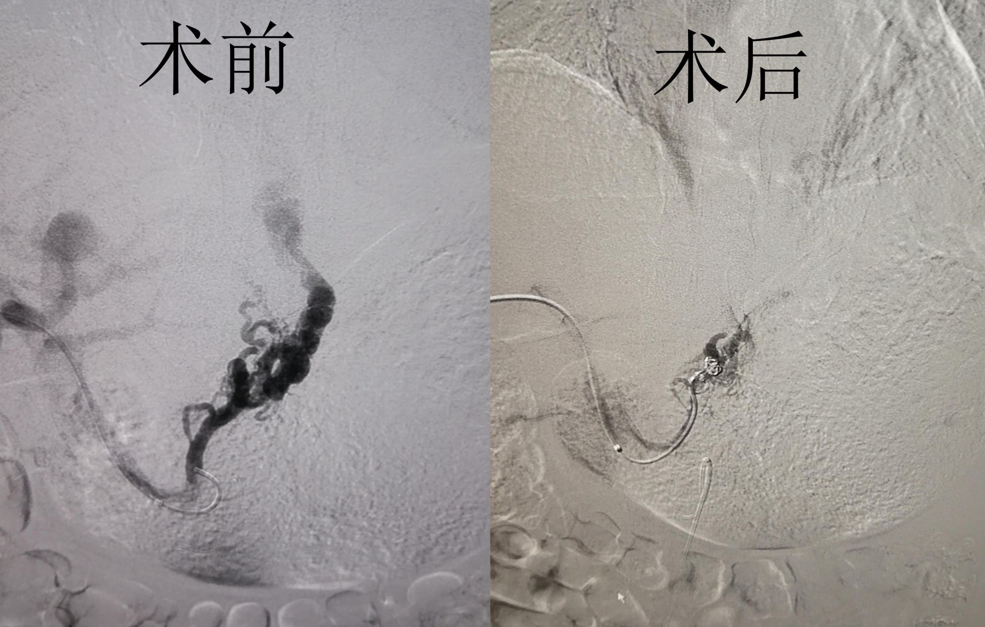 患者由于突感上腹部不适,大量呕血来我院就诊,初步诊断患者为食管胃底静脉曲张破裂所致的上消化道大出血,情况十分危急。消化内科李凌燕主治医生紧急处理后,患者仍间断呕血,处于休克状态。为进一步控制出血,急请介入血管外科主任王立军会诊,考虑患者门脉高压引起胃底食管静脉曲张破裂出血,随时有生命危险,当前最主要的是止血,应立即行经皮经肝门造影+胃冠状静脉栓塞术。手术成功,术后患者未再呕血,病情得以控制。