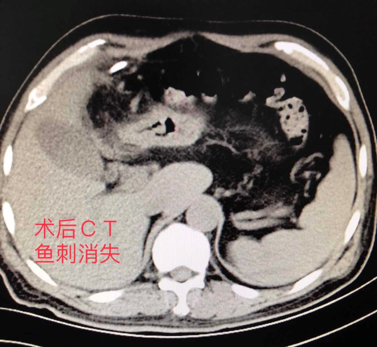 入院后行腹部强化CT显示肝左叶脓肿,胆囊与胃窦部间隙内异物(长约4cm),异物形状像极“鱼刺”。通过仔细询问得知患者2周前曾误吞鱼刺,因无明显不适感,未在意。结合病史考虑鱼刺穿过胃窦,移位至胃窦至胆囊之间,扎进肝脏导致肝脓肿。