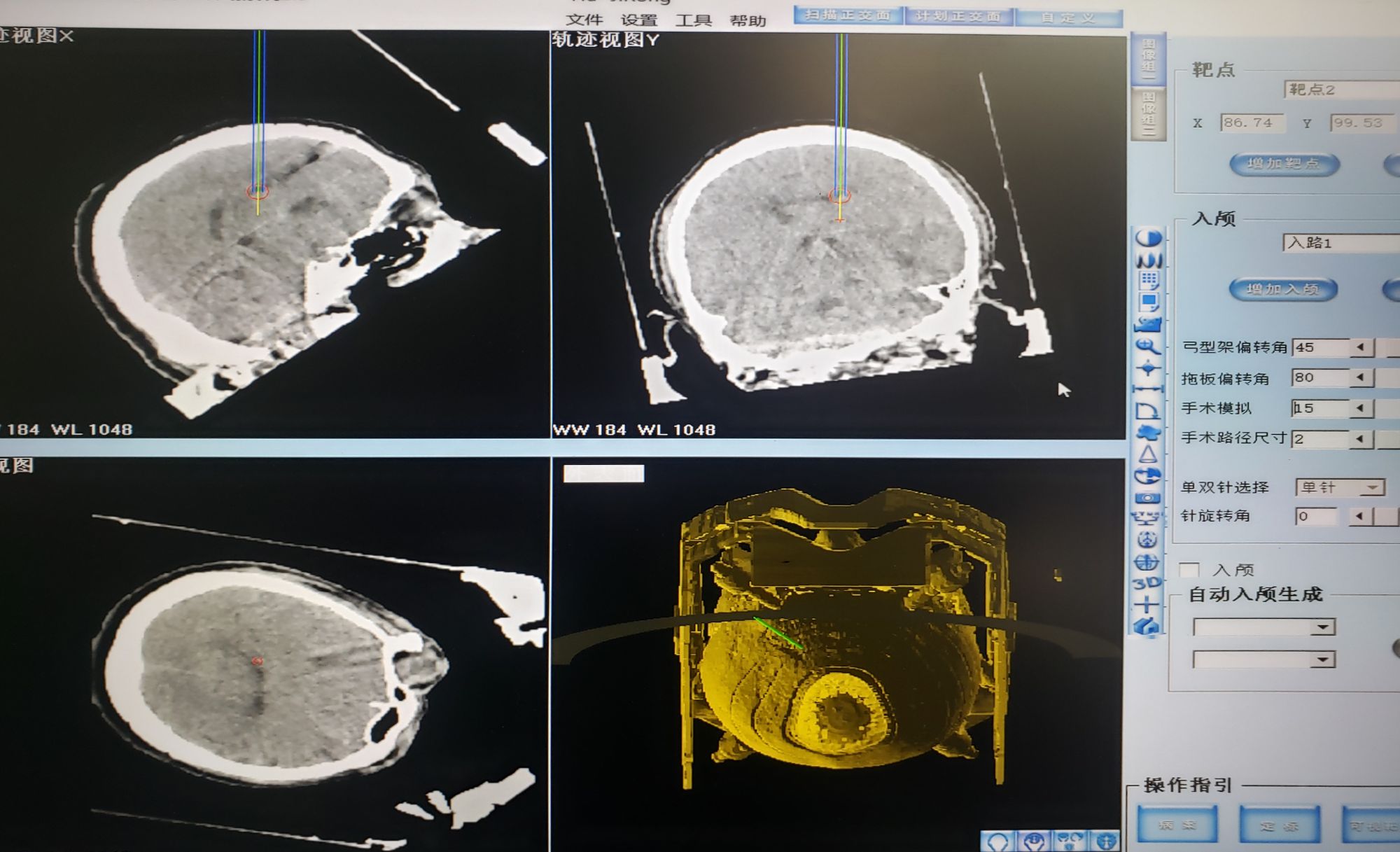 病例 (术前) 49岁的胡某,因头部昏沉不适3个月到我院神经外科就诊,颅脑MRI显示右侧丘脑占位性病变,病变性质不明。考虑到患者仅四十多岁,病灶位于重要功能区,开颅手术切除术后偏瘫风险极大。神经外科团队精确规划设计路径和靶点,安装立体定向头架后,于7月9日全麻下行立体定向脑内病灶活检术。 (术前规划设计路径和靶点) 术中按照术前规划的路径及靶点,顺利取出病变组织,术中快速冰冻病理显示为恶性肿瘤,术后送常规病理及免疫组化进一步确诊及分类。术后复查颅脑CT显示无明显出血,患者病情稳定,肢体感觉运动正常。术后第二天即下床活动。 (术中利用活检针取材) 病理诊断是脑内病灶定性诊断的金标准。立体定向活检术是明确颅内深部病变组织病理学诊断的安全、有效方法;由于立体定向三维靶点定位的误差范围在1.0mm以内,定向活检既可以补充影像技术对病变定性诊断的不足,又避免了开颅手术导致神经功能损害,而且定位准确,创伤小,安全可靠,并发症少,病人痛苦小,医疗费用低。 它不仅可提供可靠的病理学依据、达到定性诊断的目的,还可以同期配合后续治疗(肿瘤内植入放射性粒子)。立体定向活检术有不同的引导方式,且越来越先进和精细,此项技术包含很多细节和内容,技术含量高。脑立体定向手术还可用于脑出血、帕金森病、癫痫、疼痛、精神性疾病的精准手术治疗。