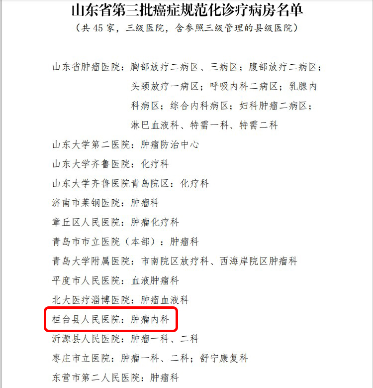 2020年12月30日,山东省卫生健康委员会公布了《关于2020年山东省癌症规范化诊疗病房评审结果的通知》,桓台县人民医院肿瘤内科榜上有名,成为山东省癌症规范化诊疗病房。