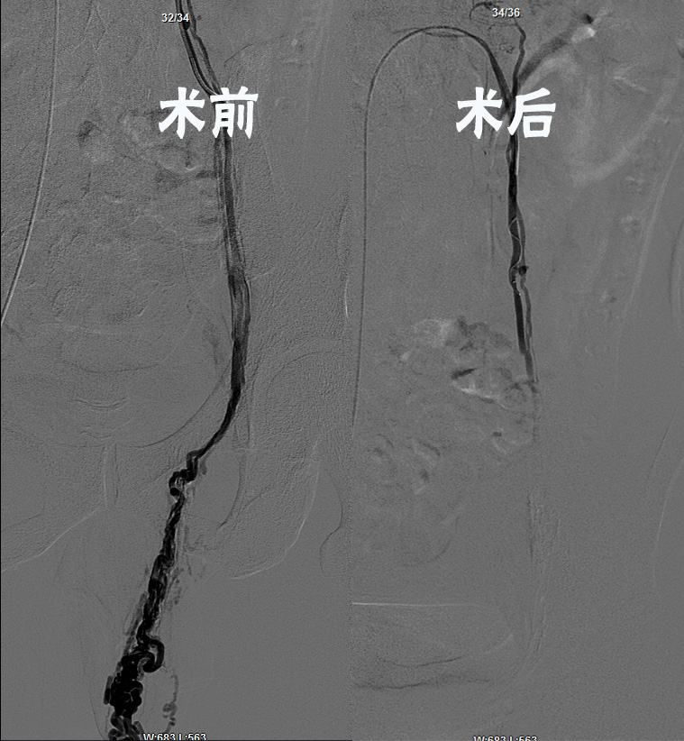 46岁的张先生左侧精索静脉曲张7年、阴囊坠胀感加重3年,严重影响正常生活,在多家医院诊断为重度精索静脉曲张,建议行常规手术或腹腔镜手术治疗。患者为免受开刀之苦,由外地慕名来到我院介入血管外科就诊。王立军主任仔细查看患者情况,发现其左侧阴囊较右侧大近一倍,做吸气、鼓肚子动作时阴囊可见曲张静脉,诊断明确,决定采用经皮介入精索静脉泡沫硬化栓塞术进行治疗。精索静脉的介入栓塞术是真正的零切口,术后6-8小时就能下地活动,第二天阴囊坠胀感明显缓解,不仅为患者解决了痛苦,且大大降低了花费。