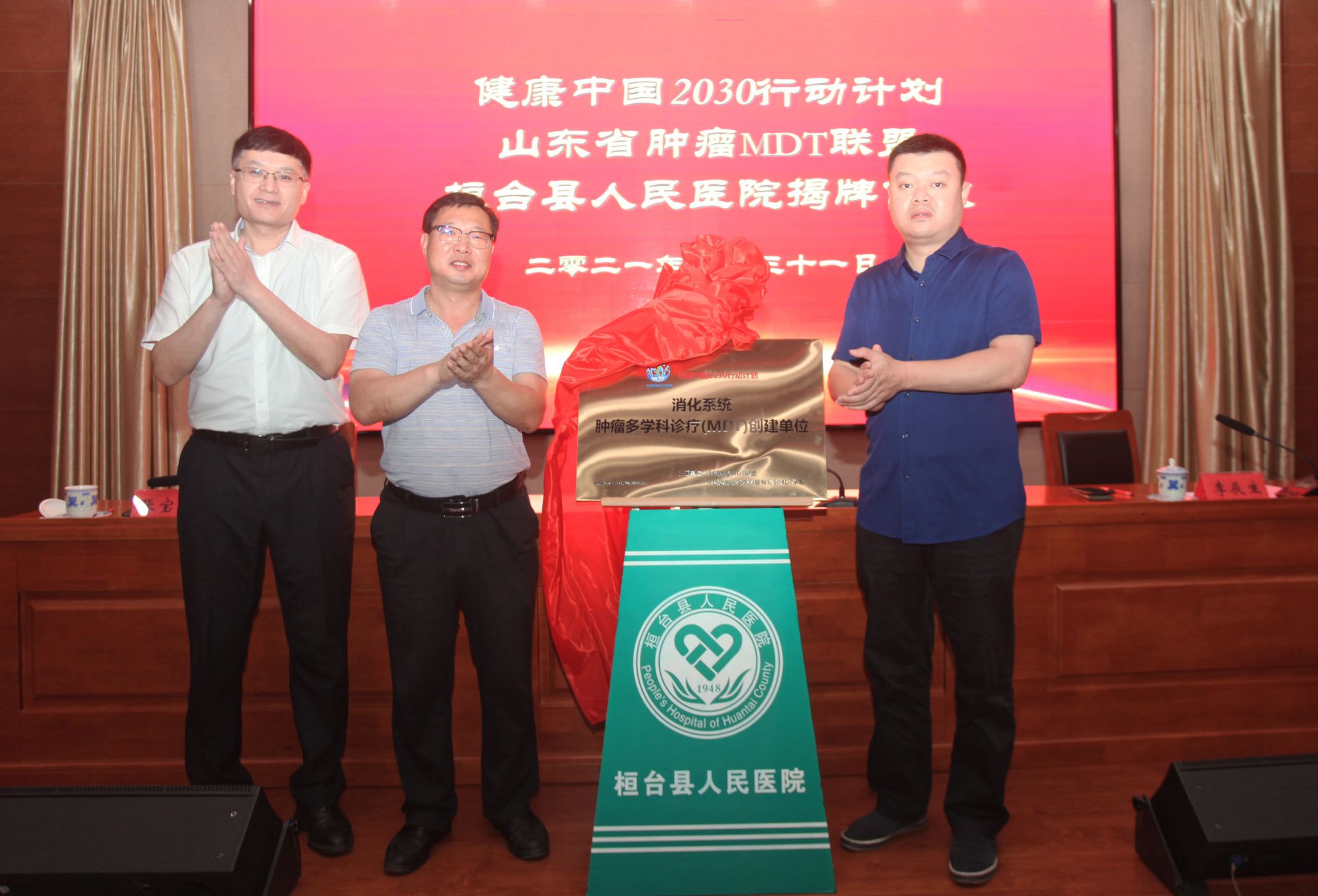 ●桓台县人民医院副院长张宝忠在致辞中表示,今天的授牌仪式证明了我院肿瘤MDT团队建设的决心。在下一步工作中,我们将通过多层次的学术交流与合作,建设肿瘤MDT联盟共建模式,加强医院之间的协作与平台搭建,资源共享,共同推动“健康中国2030”肿瘤MDT规范化推广工作。 ● 桓台县卫健局党组成员宋希君指出,桓台县人民医院作为首批进入山东省肿瘤MDT联盟成员,是对前期工作的充分认可和肯定,也带来了新的机遇和挑战,希望县医院以此次会议为新的起点,明确目标、坚定信心、扎实工作、不断努力,为加快推进健康桓台建设作出新的贡献。 ● 山东省立医院李辰生教授介绍了肿瘤MDT的优势。希望在肿瘤MDT联盟的平台上,在卫健局的领导下,医院能够提高诊疗技术水平,更好地服务桓台人民。 ● 山东省立医院李辰生教授为我院胃肠外科主任仇长敬颁发中国肿瘤MDT联盟分盟执行专家荣誉证书。 ● 宋希君、李辰生、张宝忠共同为我院消化系统肿瘤多学科诊疗创建单位揭牌。 淄博市第四人民医院张强教授作《2021CSCO胃癌肿瘤指南更新》的专题讲座。 邹平市人民医院苏忠教授、淄博市第一医院孙晓东教授、淄博市市立医院冷昌俊教授就指南更新进行了进一步解读。 桓台县人民医院院长助理、医务科主任马刚进行《桓台县人民医院MDT建设初步规划》专题讲座。 胃肠外科主治医师耿鹏就晚期胃癌转化治疗成功案例进行了分享。 淄博市市立医院赵旭教授、邹平市人民医院孙波教授、高青县人民医院王帆教授就案例与大家进行了讨论。