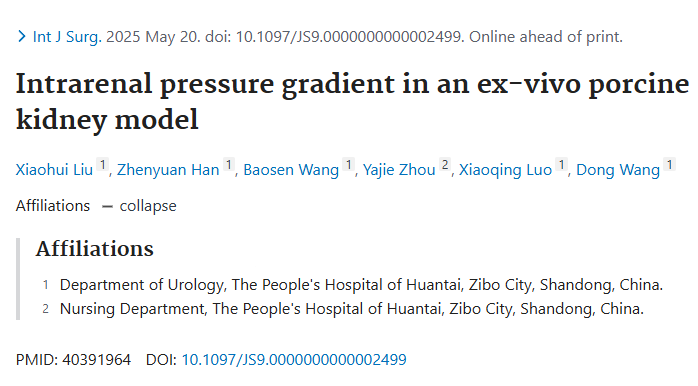 自2012年与万肖蓬博士建立合作关系以来,泌尿外科团队始终聚焦临床难题,创新性建立猪肾模型研究,推动泌尿系结石微创技术不断革新。一期实验(2021年)在万博士指导下完成猪肾模型构建,模拟真实手术环境并收集数据,论文发表于《World Journal of Urology》,影响因子3.78;二期实验(2022-2023年)获淄博市医药卫生科研项目立项(编号20230405045),论文再次被《World Journal of Urology》收录,课题于2024年9月顺利结题;三期实验(2024-2025年)获山东省医院卫生科技项目立项(编号202304050720),成果发表于《International Journal of Surgery》,PUBMED已开放检索。