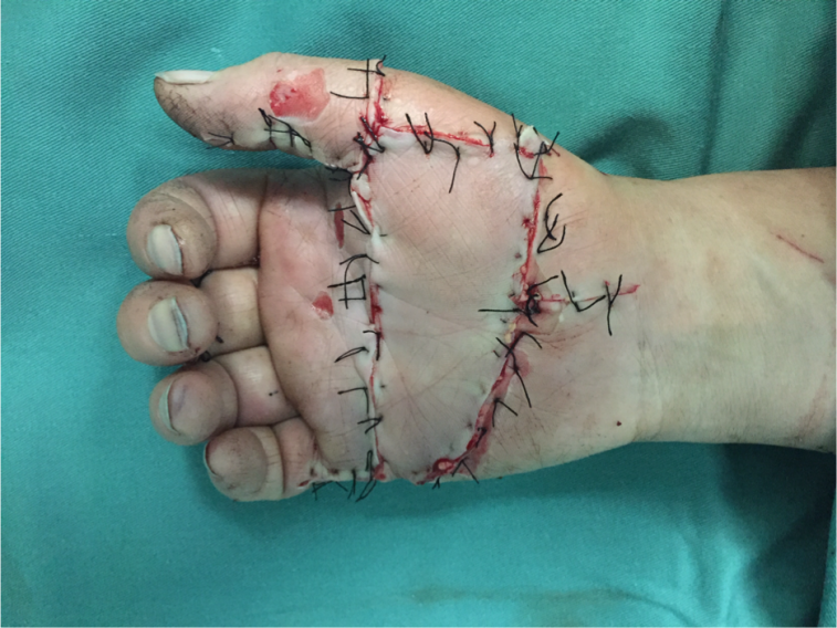 典型病例5:机器挤压伤,指骨骨折,血管缺损,腕横纹皮瓣Flow-through修复,愈合良好