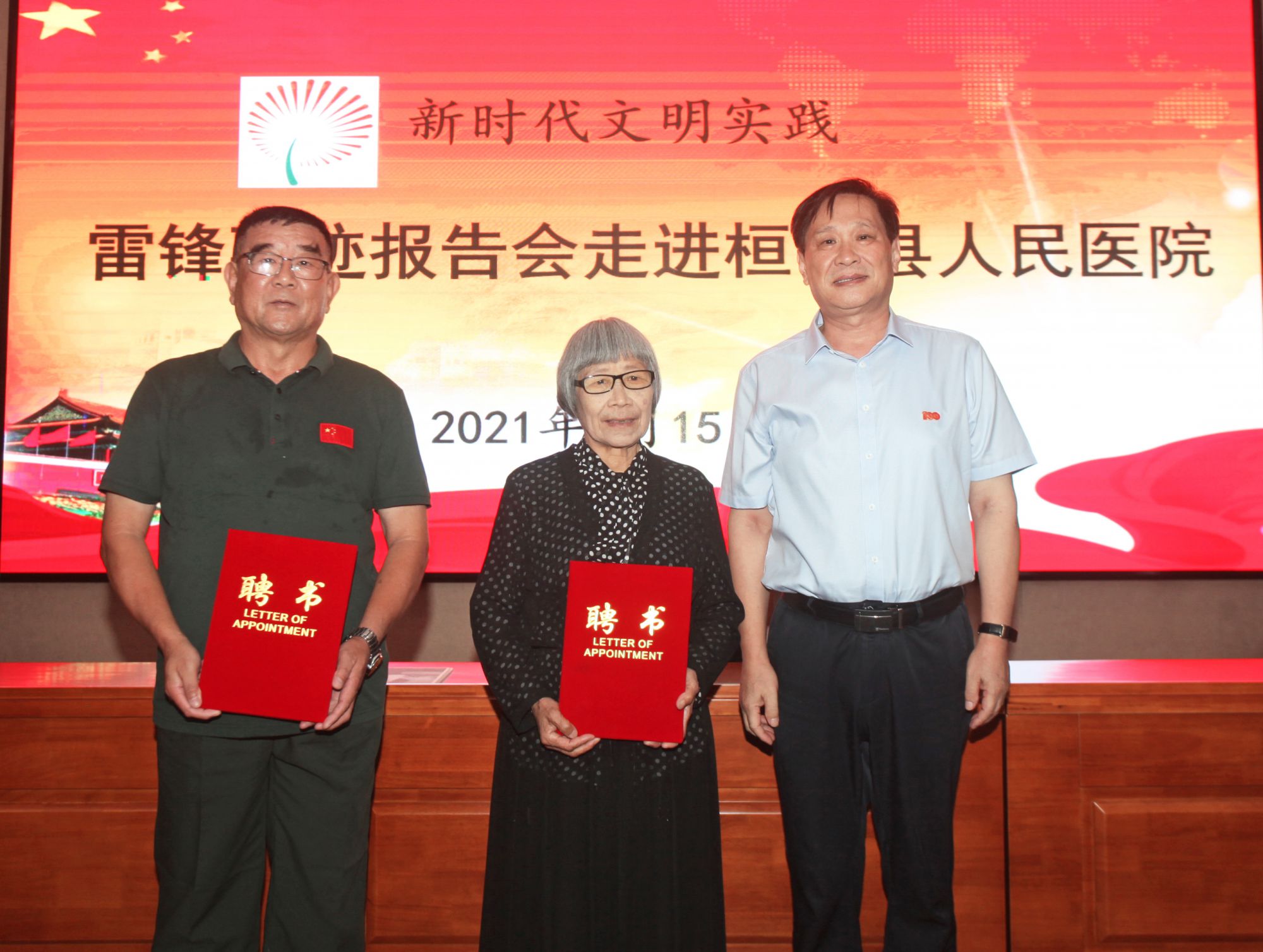 9月15日下午,桓台县人民医院举办雷锋事迹报告会。邀请雷锋的湖南老乡、鞍钢工友易秀珍,新时代雷锋精神种子传播人、雷锋旅荣誉战士谭卫兵来院作雷锋事迹报告,医院党委书记、院长李立新,领导班子和管理团队成员,中层干部,“雷锋岗”医务人员共100多人参加了会议。