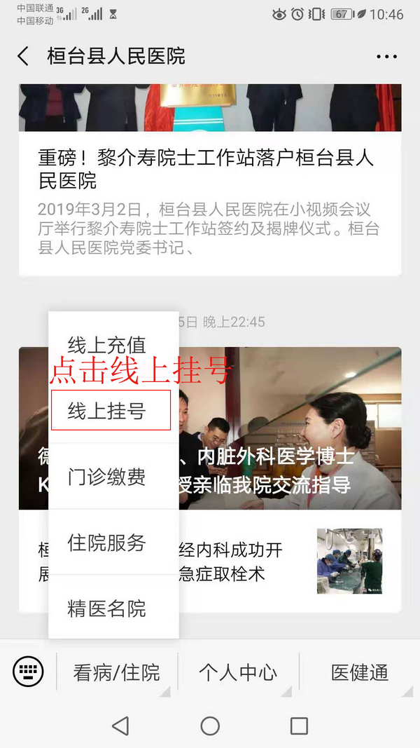进入微信服务号后,从微信自定义菜单中选择“看病/住院”,再点击“线上挂号”,如下图所示